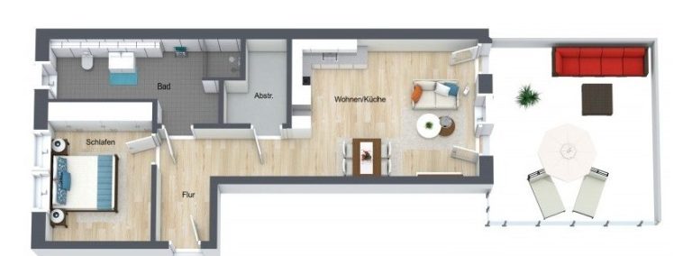 Die 75 m² Wohnfläche verteilen sich auf das Wohn-/Esszimmer mit einer Einbauküche inkl. Abstellraum und direktem Zugang zum großen Balkon, ein großes Schlafzimmer, ein Bad mit WC und Dusche und den Flur. Ein Abstellraum in der Wohnung und ein eigener Kellerraum bietet ausreichend Stauraum. Die Wohnung befindet sich in 1. Obergeschoss